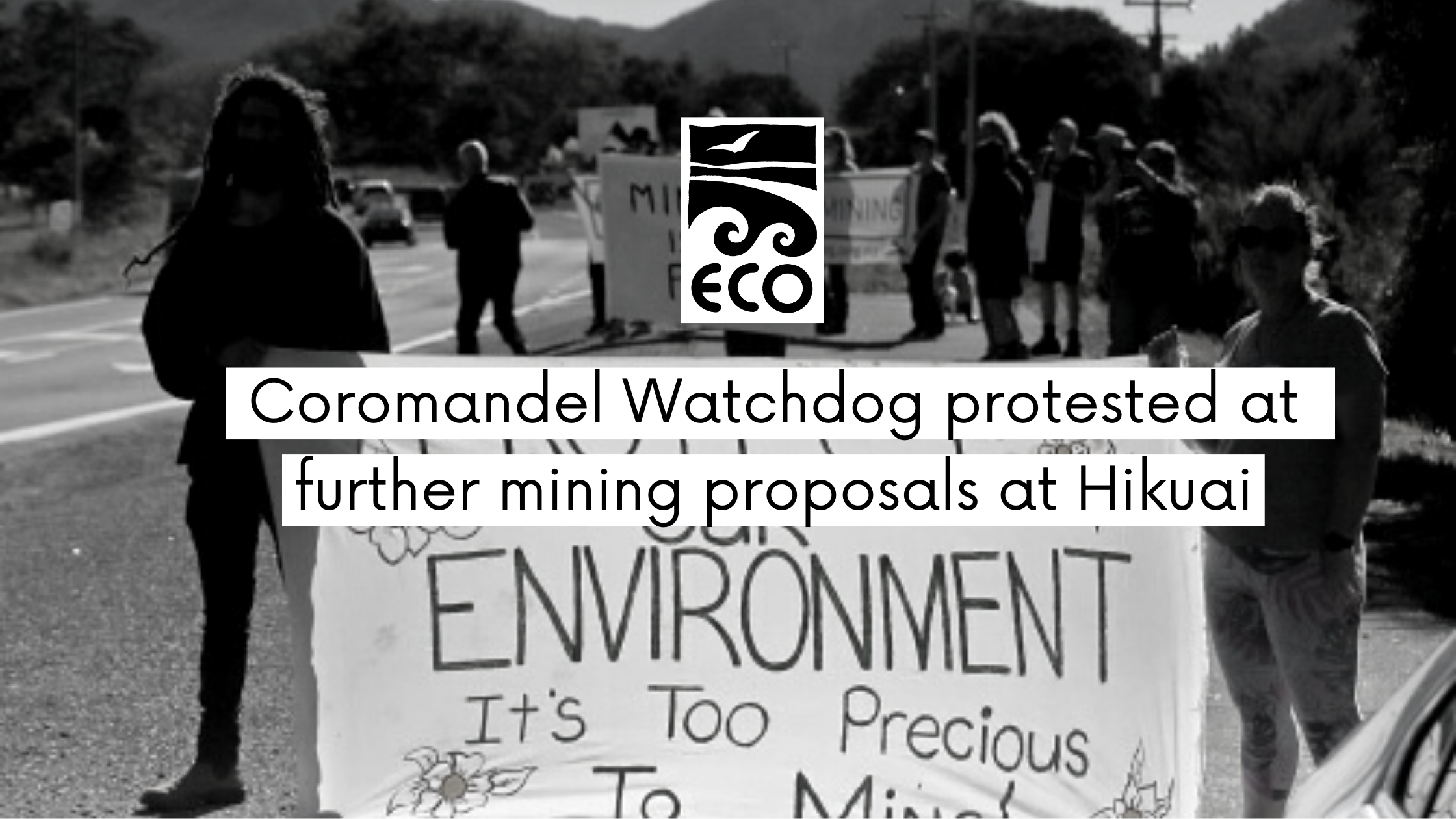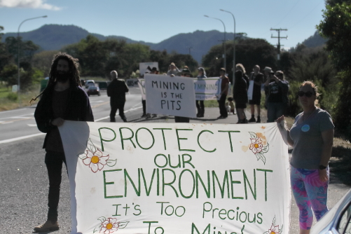 On Easter Friday, members and supporters of Coromandel Watchdog protested at further mining proposals at Hikuai, south of Tairua on the Coromandel Peninsula. Multi-national Oceana Gold has an exploration permit across Hikuai and an adjacent one in Kauaeranga valley.